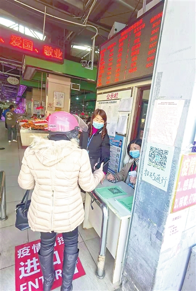 1月14日9时许,记者从市场2号门进入,值守人员示意记者扫健康码、测体温方可进入市场。走进蔬菜交易区,100多个摊位的商户全部佩戴了口罩。在水果交易区,一张姓商户称,该市场被曝光后,管理部门要求商户们每天都要测量体温、扫健康码、佩戴口罩才能入场。记者回访期间,有市场工作人员来到摊位前,检查商户的疫情防控工作是否到位。