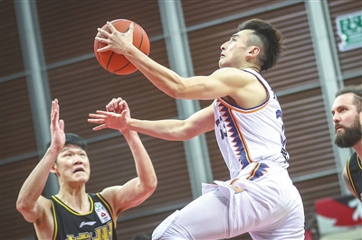 1月17日,上海队球员罗汉琛(中)在比赛中上篮。当日,在2020-2021赛季CBA第二阶段第31轮比赛中,浙江广厦控股队以117∶112战胜上海久事队。新华社记者 潘昱龙摄