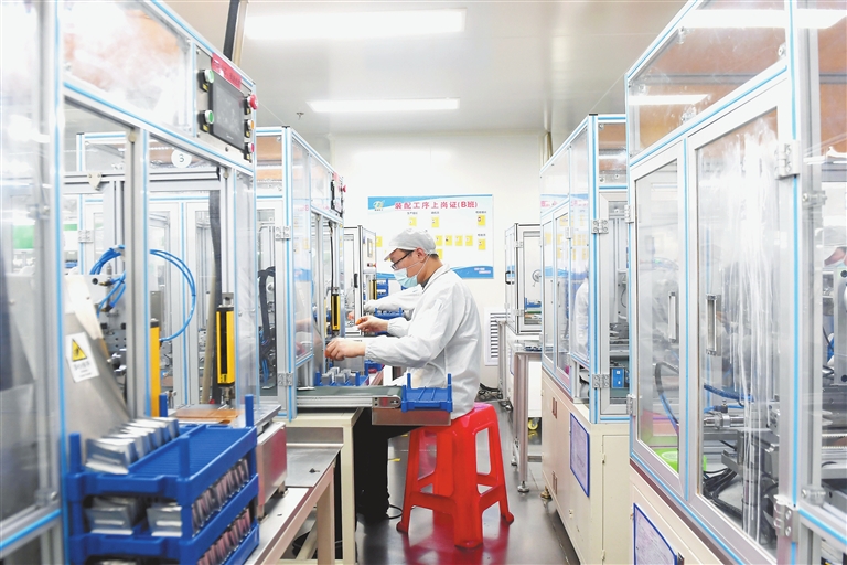 1月28日,新余赣锋电子有限公司的员工在生产线上忙碌。该公司位于新余高新区,主要生产移动电源、蓝牙音箱等电子产品的电池,产品远销海内外。目前,工人们正加班加点赶订单,冲刺新年开门红。本报记者 曹 耘摄