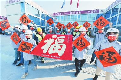 2月3日,北京建工路桥集团留京过年的技术员和工人们展示他们收到的“福”字。 当日,由北京市总工会主办的“快快乐乐过大年 我把祝福寄回家”活动在北京建工路桥集团建筑工地举行。北京市总工会请摄影师为200多名留京过年的劳动者拍摄了照片,劳动者们把用自己照片制作的“福卡”以及工会赠送的新春“福包”一起寄给家人,表达思念和祝福。