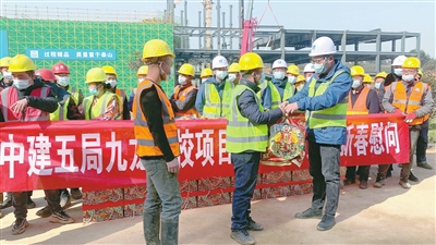 见此情景,中建五局兴城学校项目经理李立平笑着插话:“你们放心,项目部一定会为大家做好过年的准备,今天就会发放慰问品。”