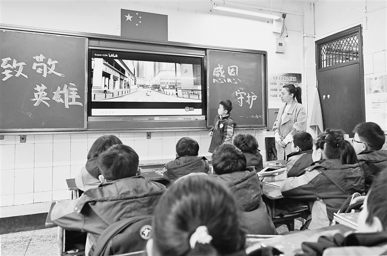 3月1日,南昌市邮政路小学组织2000余名学生,通过开展“致敬英雄、感恩守护”主题班会,以向新时代卫国戍边英雄致敬等方式,培养孩子们的爱国情怀和感恩之心。本报记者 李 劼摄