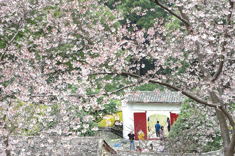 2月24日,春光明媚,庐山方竹寺内的几株三百多年树龄的樱花渐次开放,暖阳之下,樱花开满枝头,芳菲争艳。以往方竹寺樱花盛开在三月份,今年受气温影响,花期提前近半月左右。早春樱花烂漫,吸引众多游客前来观赏,古寺也成为“网红”打卡地。 通讯员 韩俊烜摄