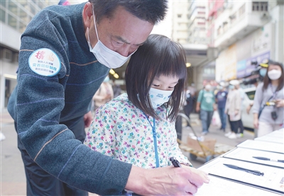 在九龙弥敦道街站,退休职员陈炳玉在签名簿上一笔一画写下姓名。“我是土生土长的香港人,国家为香港好,我为什么不支持?香港之前被搞乱,我们中国人为什么要任由别人对我们说三道四?”