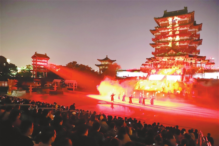 当大家沉浸在滕王阁夜色中时,忽闻乐声阵阵,原来是《寻梦滕王阁》开演。伴随着声光电特效,滕王阁幻化成追述历史的奇幻舞台。江西历代圣贤超越时空相聚滕王阁,游客在观演中与先贤跨越千年对话。