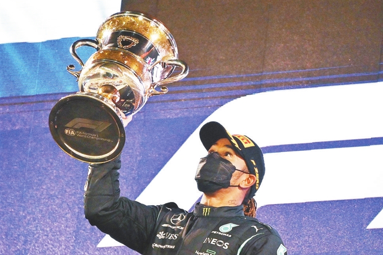 3月28日,梅赛德斯车队英国车手汉密尔顿在颁奖仪式上。当日,在2021赛季F1(世界一级方程式锦标赛)巴林大奖赛正赛中,汉密尔顿夺得冠军。新华社/法新