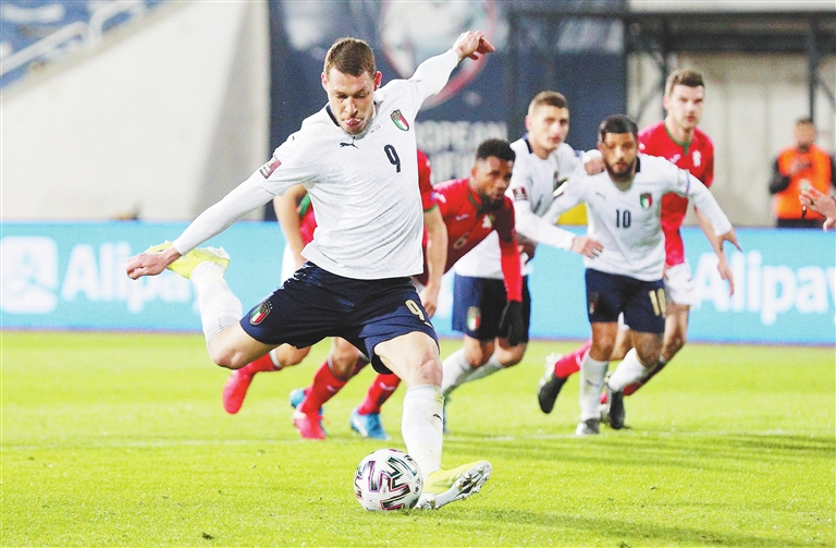3月28日,意大利队球员贝洛蒂在比赛中主罚点球命中。当日,在索非亚进行的2022年世界杯欧洲区预选赛C组比赛中,意大利队客场以2∶0战胜保加利亚队。新华社/路透