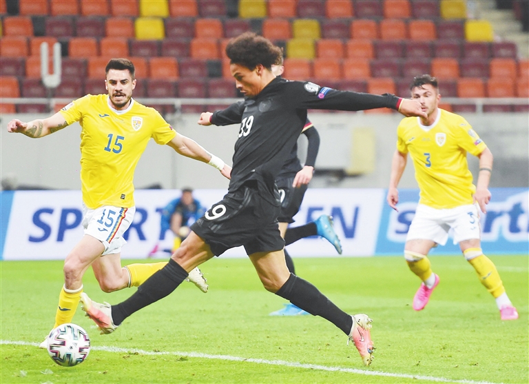 3月28日,德国队球员萨内(前)在比赛中突破。当日,在布加勒斯特进行的2022年世界杯欧洲区预选赛J组比赛中,德国队客场以1∶0战胜罗马尼亚队。新华社/法新
