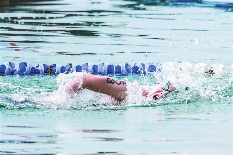 3月28日,吉林选手董馥玮在比赛中。她以2小时04分22秒3的成绩获得个人冠军。当日,2021年全国马拉松游泳冠军赛女子10公里决赛在深圳举行。新华社发 (彭志刚摄)