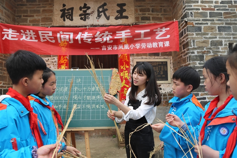 3月29日,吉安市凤凰小学师生将课堂“搬”进吉安市吉州区兴桥镇东塘村,实地学习民间传统手工艺——草绳制作。