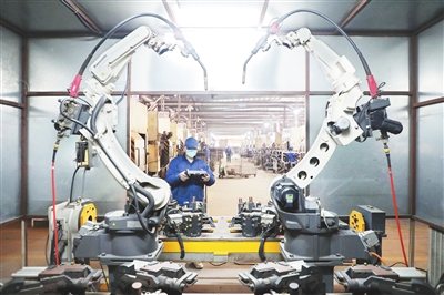 今年以来,随着各项惠企政策的落实和资金、用工等难题的破解,东乡经济开发区规上企业订单不断,全部开足马力赶制订单。图为江西荣成机械有限公司生产车间内,员工正在操作摆臂机器人进行焊接作业。
