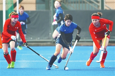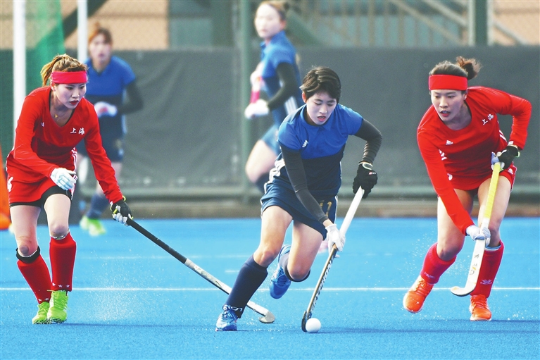 3月30日,辽宁队球员张萧雪(中)在比赛中带球突破。 当日,在江苏常州举行的2021年西安全运会女子曲棍球资格赛A组第四轮比赛中,辽宁队以1∶0战胜上海队。新华社发 (史 康 摄)