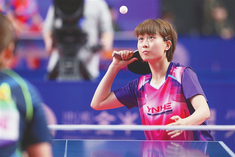 3月30日,天津队选手刘炜珊在比赛中发球。她以0∶3负于辽宁队选手陈幸同。 当日,在成都市举行的2021年全运会乒乓球项目资格赛女子团体第五轮比赛中,辽宁队以3∶0战胜天津队。辽宁队、天津队分别以A组小组第一、第二名的成绩晋级决赛。新华社记者 刘梦琪摄
