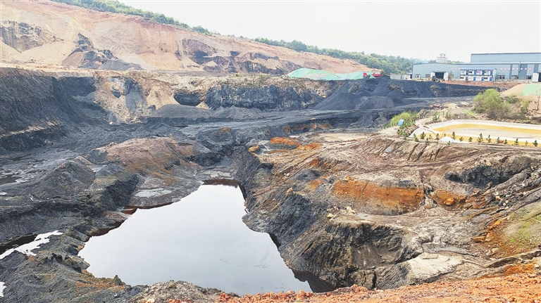 3月23日,记者来到乐港镇塔瑞村,从山脚向上穿过一片密林,很快就看到一个巨大的深坑。深坑向上,是一侧基本挖空的山头,裸露了大面积的黄土,与山体另一侧郁郁葱葱的树木形成鲜明对比;深坑四周,是一片乌黑的煤矸石矿,中间还沉积了红褐色污水。离深坑不远处,便是富鑫公司的厂房、矿石和工程车辆。