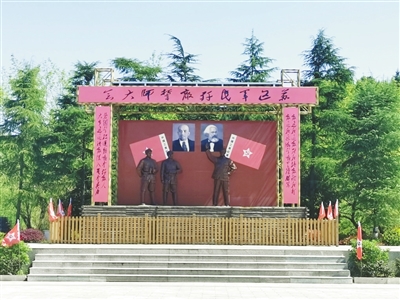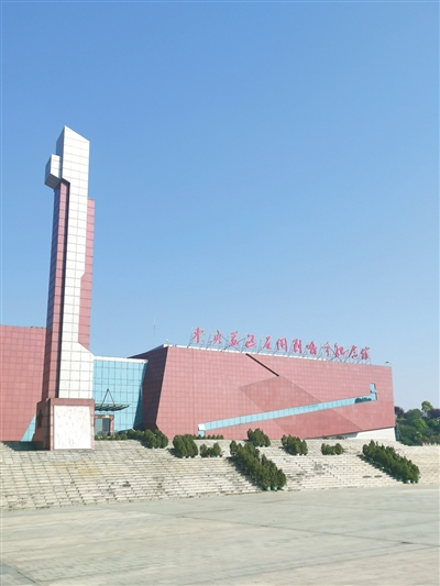 纪念馆左边矗立着一块石碑,形如一杆钢枪,直指苍穹。馆前的广场上,6根红色石柱相对而立,石柱上雕刻的红军战士或紧握钢枪,怒目圆睁;或头戴八角帽,傲然挺立;或俯身弓步,犹如即将扑向战场的猛虎……