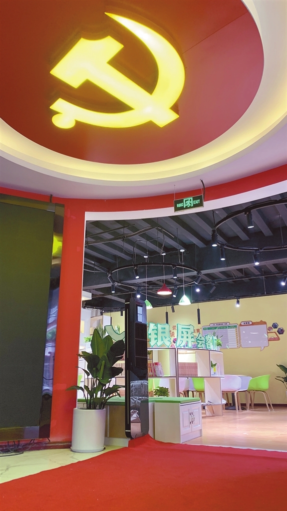 3月31日,记者来到银铃驿站,一进门就看到一块曲面电子大屏里正播放电影《建军大业》。再向里走,是一个占地200多平方米的银屏会客厅,淡黄色的墙壁搭配绿色和白色的桌椅、灯具,十分温馨。