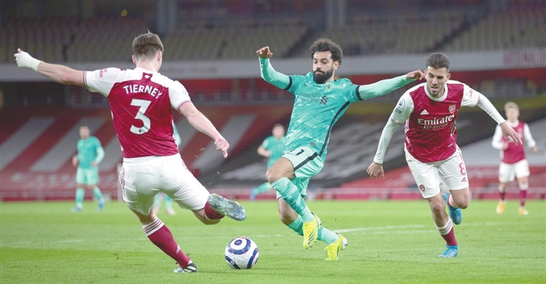 4月3日,利物浦队球员萨拉赫(中)与阿森纳队球员蒂尔尼(左)拼抢。当日,在英超联赛第30轮比赛中,利物浦队客场以3∶0战胜阿森纳队。新华社发 (洛克莱夫摄)