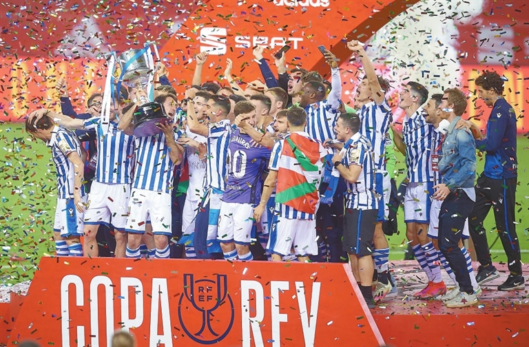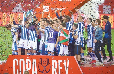 4月3日,皇家社会队球员在颁奖仪式上庆祝。 当日,在塞维利亚进行的2019-2020赛季国王杯决赛中,皇家社会队以1∶0击败毕尔巴鄂竞技队,夺得冠军。受新冠疫情影响,2019-2020赛季国王杯决赛调整到2021年4月3日举行。新华社发 (帕布罗·莫拉诺摄)