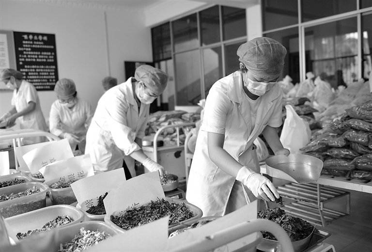 4月10日,在瑞丽市中医傣医医院,医务工作者在中药调剂室配药。为应对新冠肺炎疫情,云南省瑞丽市中医傣医医院根据中医药专家意见并结合当地疫情实际熬制中药汤剂,免费送给抗疫一线工作者、居家隔离群众等人员。据介绍,中医傣医医院中药汤剂近期每天的生产量接近3万袋,截至目前已生产13.2万多袋。 新华社记者 陈欣波摄