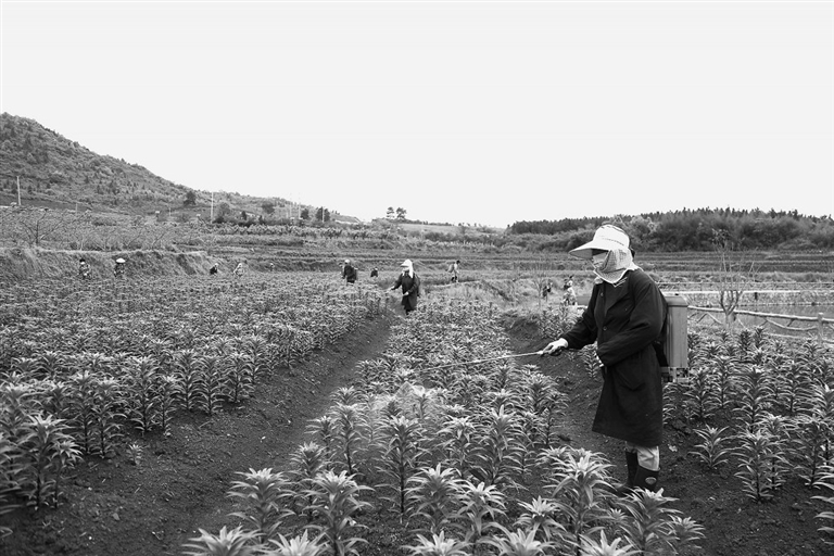 4月10日,莲花县六市乡海潭村百合基地,村民正在进行田间管理。该基地近1000亩,采用合作社+基地+村民的模式,解决了30多个农村劳动力就业,人均月收入近千元。
