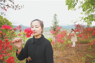 4月8日,游客在莲花县坊楼镇田垅村牛鼻山游览、拍照。牛鼻山存有当年红军作战遗迹,近年来,该村将生态旅游和红色景观有机结合,让游客在赏花的同时,增加对红色历史的了解。 特约通讯员 贺治斌摄