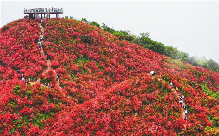 | 4月11日,第十二届井冈山市杜鹃花节开幕。多年来,井冈山以花为媒,坚持以文促旅,以旅彰文,杜鹃花节已成为井冈山品牌形象的一张重要名片。(史港泽 摄) |