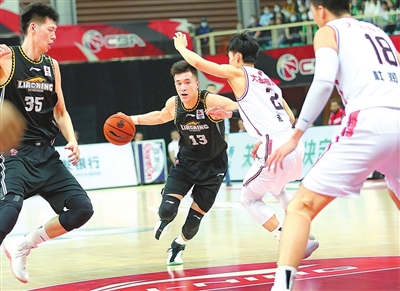 4月27日,辽宁本钢队球员郭艾伦(左二)在比赛中运球突破。当日,在CBA总决赛首场比赛中,广东东莞大益队以88∶83险胜辽宁本钢队。新华社记者 孟永民摄