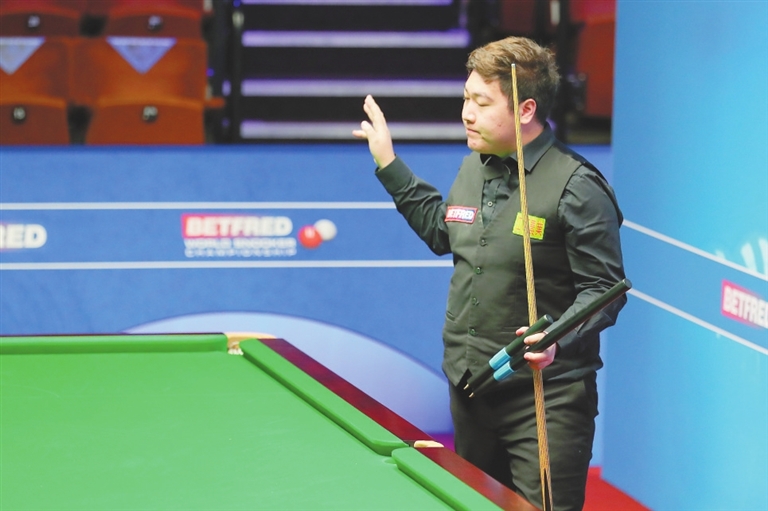 4月26日,颜丙涛在第二轮比赛结束后向观众致意。 当日,在英国谢菲尔德进行的2021年斯诺克世锦赛第二轮比赛中,中国选手颜丙涛最终以7∶13不敌英格兰选手墨菲,无缘下一轮。新华社发 (翟政摄)