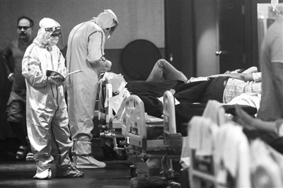 5月1日,医务人员在印度新德里的一家宴会厅改造成的新冠病房内工作。