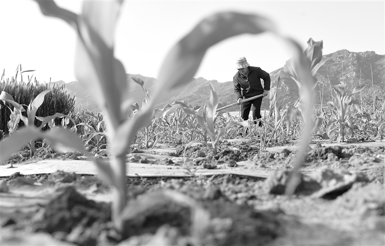5月5日,在江苏省连云港市朝阳街道西庄村,村民在玉米地里除草、松土。 新华社发(耿玉和摄)