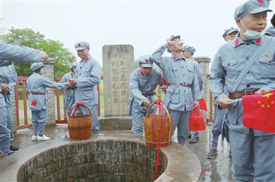在瑞金红井旧址旁,来自全国各地的游客喝上一口甘甜的井水,感受共产党人当年“为群众办实事”的初心;在朱毛红军挑粮小道上,一群扛着红旗、挑着扁担、穿着红军服的队伍正在体验当年红军挑粮上山的艰辛。沿着高速公路看江西,红色标识随处可见、红色景点人人熟知、红色歌曲人人传唱。
