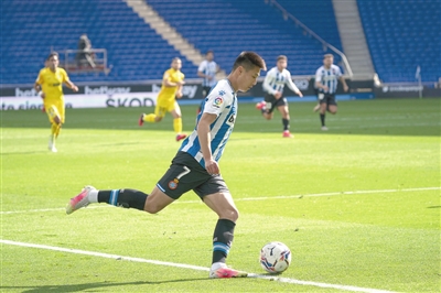 5月3日,西班牙人队球员武磊在比赛中。当日,在2020-2021赛季西乙联赛第37轮比赛中,西班牙人队主场以3∶0战胜马拉加队。新华社发 (胡安·戈萨摄)