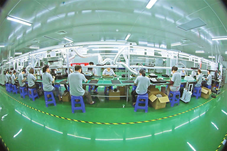 5月18日,在全南县江西络鑫科技有限公司生产车间,工人正紧张有序地赶制订单。该县作为粤港澳大湾区电子信息产业转移的承接地,目前已落户电子信息企业48家,建成了完整电子信息产业链。