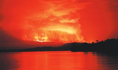 这是5月22日在刚果(金)境内的基伍湖拍摄的尼拉贡戈火山喷发时的景象。 刚果(金)政府22日说,位于该国东北部北基伍省的尼拉贡戈火山当晚喷发,目前尚无重大人员伤亡和财产损失的报告。尼拉贡戈火山曾于2002年大规模喷发,造成戈马大部分地区被火山熔岩覆盖,50多万人逃离家园。新华社/路透