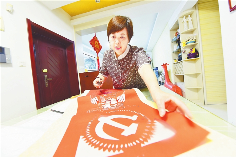 5月17日,宁都县民间艺人曾晓梅在家中制作剪纸作品。曾晓梅将剪纸艺术与赣南红色文化结合起来,用剪纸作品表达对党的感恩之情和对祖国的衷心祝福。 通讯员 曾嵘峰摄
