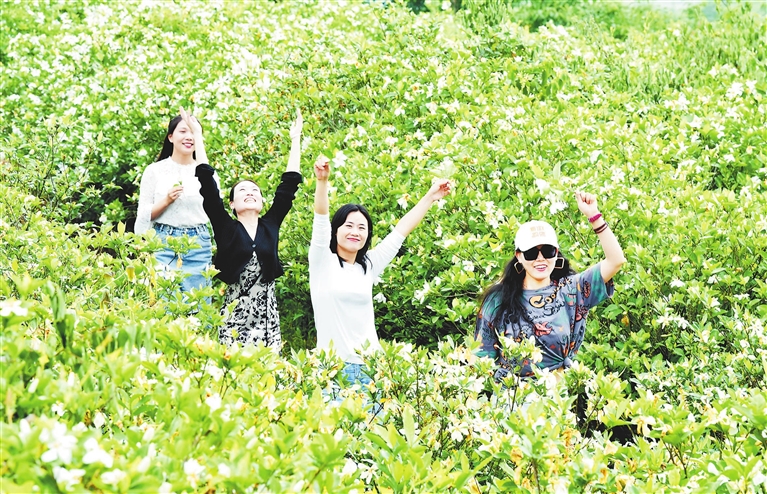 5月20日,在大山深处的乐平市高家镇桐林街刘家坞千亩黄栀子生态农业基地,游客正在花海中赏花观景、拍照留念。