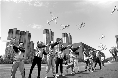 学生在放飞航模。