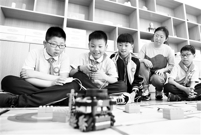 学生在进行机器人设计成果展示。