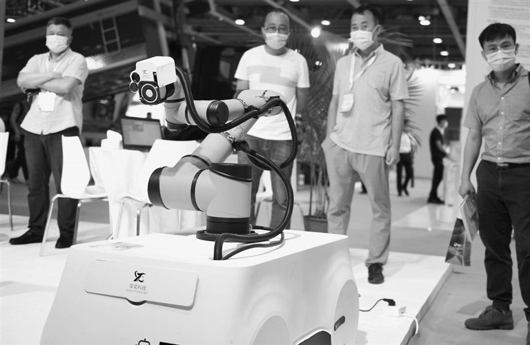 5月25日,客商在2021广州国际汽车技术展览会上观看一台汽车充电机器人演示自动充电。当日,2021广州国际汽车技术展览会在广州保利世贸博览馆开幕。据了解,本届展会覆盖了汽车电子技术、汽车轻量化技术、车联网技术、汽车部件及加工技术、自动驾驶技术等领域,吸引国内外厂商前来参展。 新华社记者 卢汉欣摄