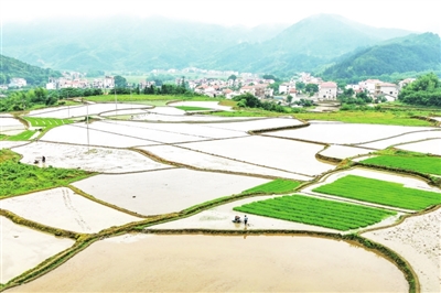近日,遂川县草林镇唐虞村,山头雨雾弥漫,田园水面如镜,村里红顶民房,构成一幅美丽的风景画。 肖远泮摄
