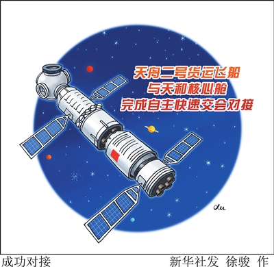 新华社海南文昌5月30日电 (记者黎云、张汨汨)据中国载人航天工程办公室消息,天舟二号货运飞船入轨后顺利完成入轨状态设置,于5月30日5时01分,采用自主快速交会对接模式,精准对接于天和核心舱后向端口,整个过程历时约8小时。