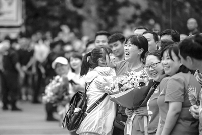 6月8日,考生在贵州省贵阳市乌当中学考点外和老师拥抱。当日,全国部分地区2021年高考结束。