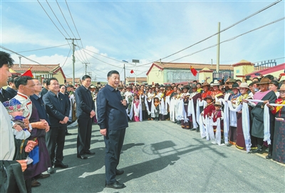 离开索南才让家,村民们看到总书记来了,热情地涌到路边,欢呼着向总书记问好。习近平动情地说,看到乡亲们过上幸福生活,我感到很欣慰。我们要继续奋斗,到新中国成立一百周年时中华民族一定能够更加坚强地屹立于世界民族之林。全面建设社会主义现代化国家,一个民族也不能少。在中华民族大家庭中,大家只有像石榴籽一样紧紧抱在一起,手足相亲、守望相助,才能实现民族复兴的伟大梦想,民族团结进步之花才能长盛不衰。习近平祝福大家“扎西德勒”。