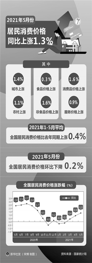 国家统计局9日发布数据,5月份,全国居民消费价格指数(CPI)同比上涨1.3%,保持总体稳定;全国工业生产者出厂价格指数(PPI)同比上涨9.0%,涨幅比上月扩大2.2个百分点。