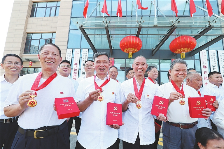 为庆祝中国共产党成立100周年,日前,南昌高新区麻丘镇举行了2021年“光荣在党50年”纪念章颁发仪式,现场向19名党员颁发了“光荣在党50年”纪念章。据悉,该镇共有134位老党员获得“光荣在党50年”纪念章。李维捷摄