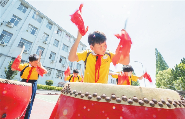 6月7日,分宜县杨桥镇中心学校锣鼓队的孩子们正练习威风锣鼓。分宜县依托乡村少年宫平台,将锣鼓、铃鼓、绘画、剪纸、舞蹈等传统艺术列入教学活动,丰富了乡村学生的第二课堂。