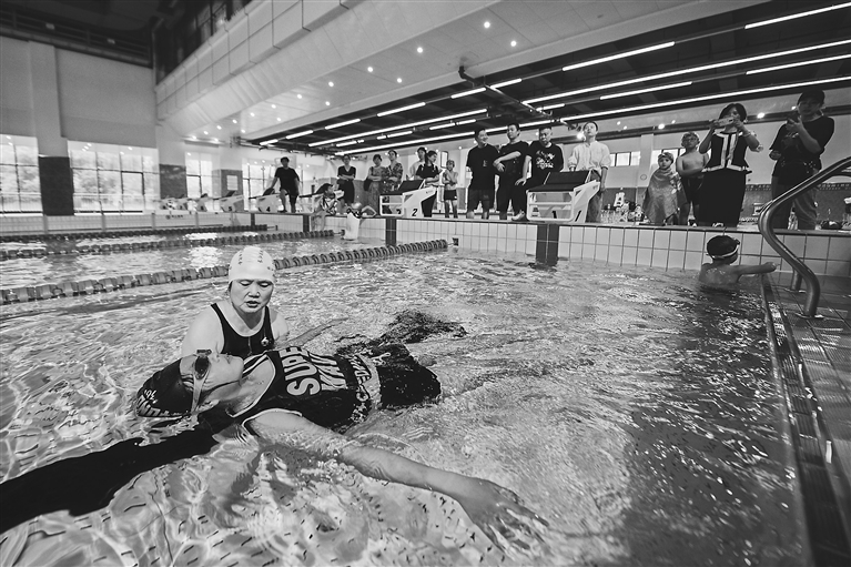 6月26日,小朋友在志愿者的指导下练习落水后的应急自救方法。