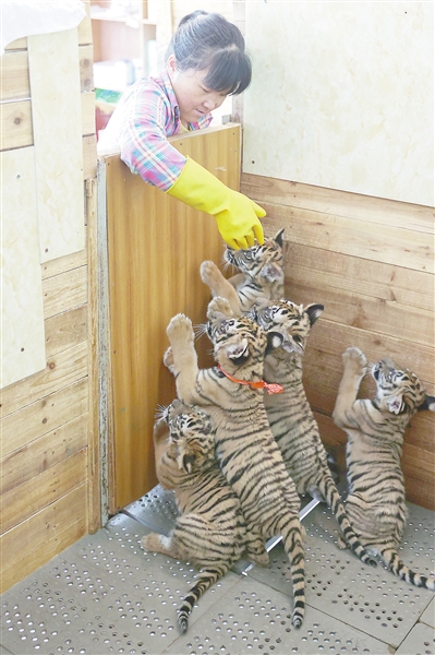 6月24日,南昌动物园育幼室,活泼可爱的小老虎在动物园育幼师的照料下茁壮成长。据悉,今年上半年南昌动物园的华南虎种群再添新丁,9只新生虎仔成功存活。目前,南昌动物园华南虎数量达到46只。本报记者 洪子波摄