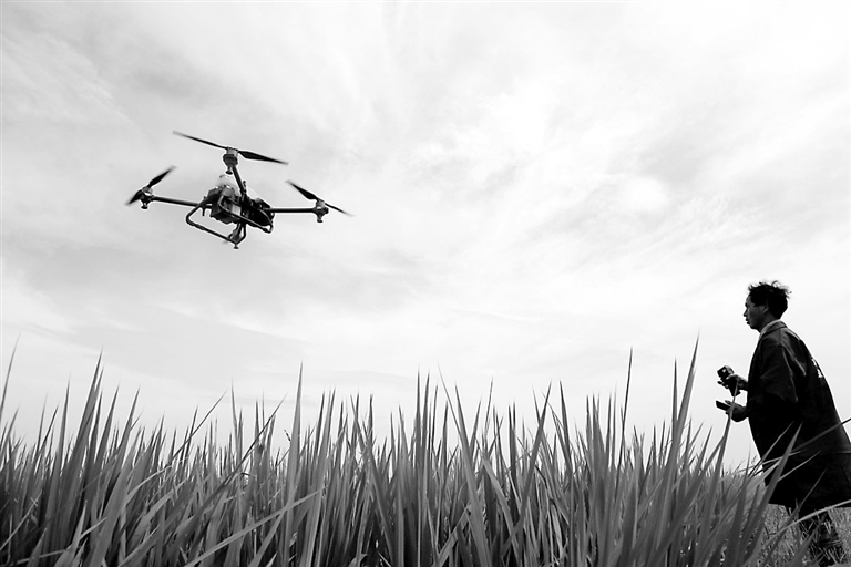 7月4日,峡江县水边镇义桥村种植专业合作社,农民利用植保无人机进行水稻喷防作业。该县26万余亩水稻进入灌浆成熟的关键期,当地农业部门引导农民强化稻田科技管理,利用植保无人机进行大规模田间作业,提高田管效率,确保夏粮丰收。