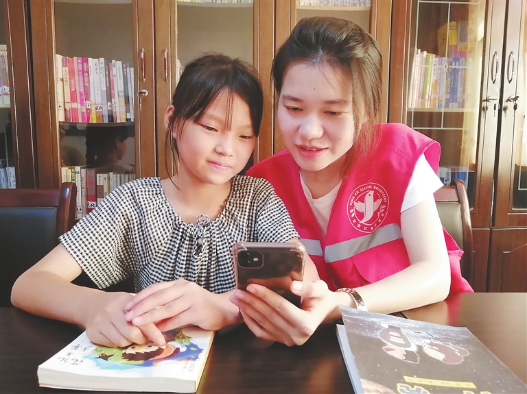 7月14日,宜春市袁州区新坊镇合浦村新时代文明实践站内,志愿者正在为外出务工人员子女开展“亲情连线”活动。“我为群众办实事”实践活动开展以来,该镇已为66名留守儿童架起与亲人沟通的“连心桥”。通讯员 黄艳冰摄